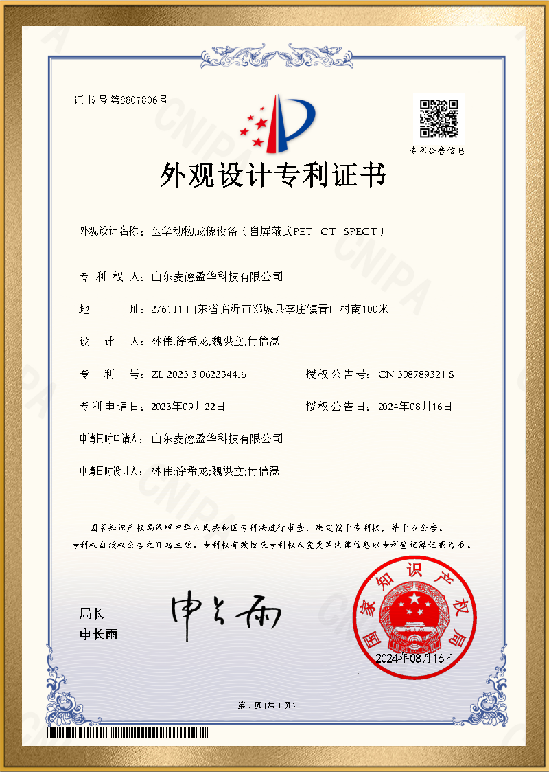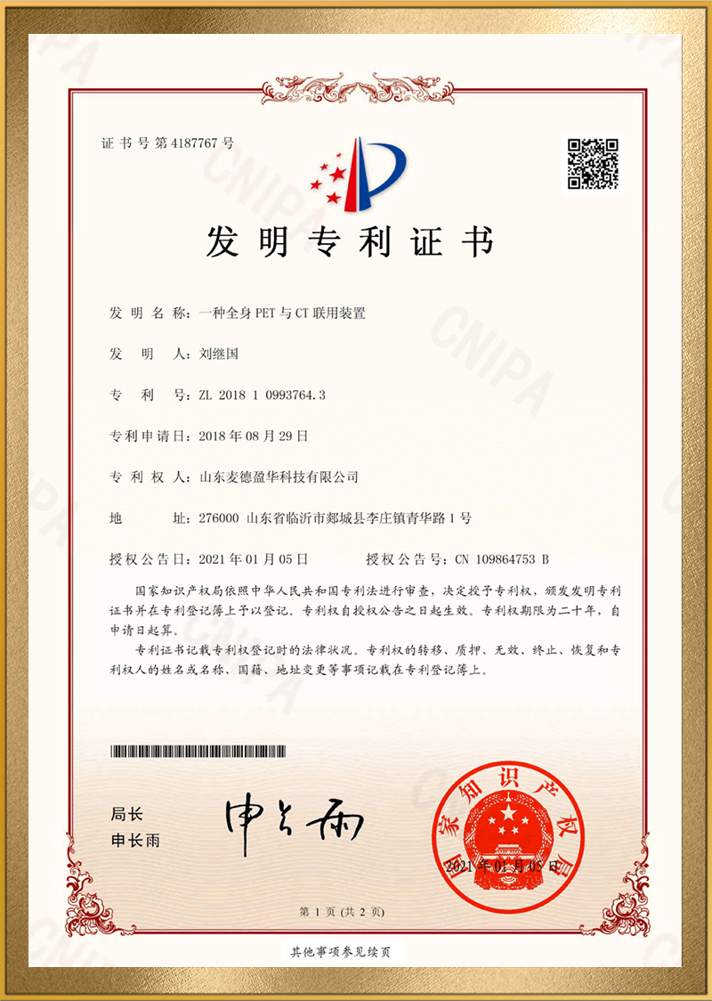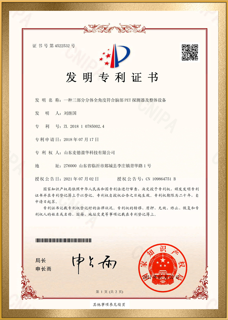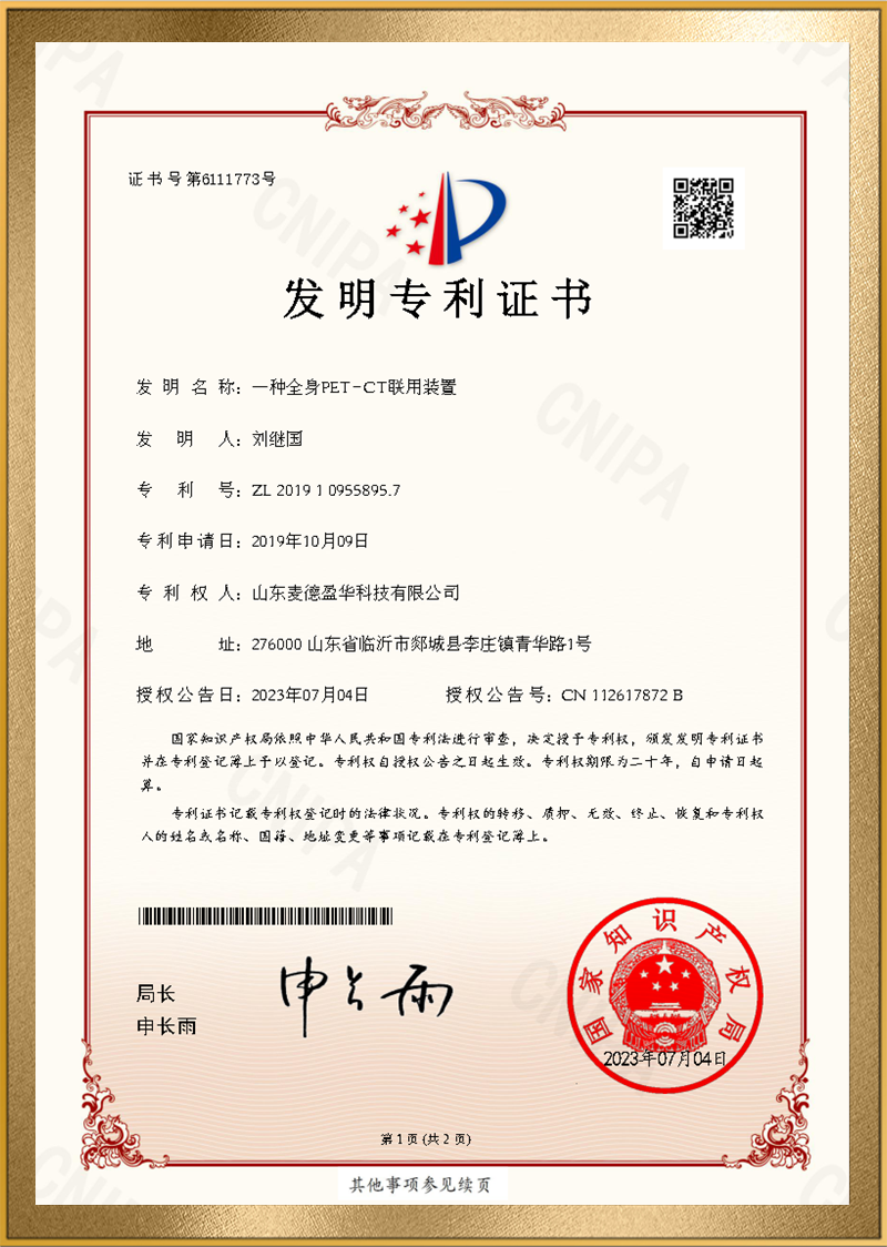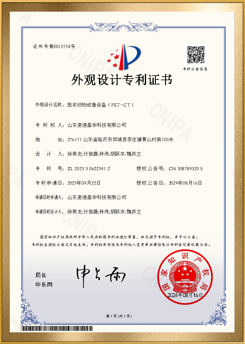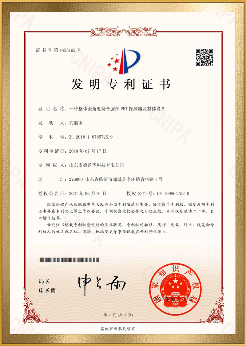 麦德盈华是国家高新技术企业,省级“专精特新"企业,公司拥有山东省“一企一技术”研发中心,临沂市PET系统开发及应用工程技术研究中心,PET系统开发及应用企业重点实验室,并创建了山东省高等学校肿瘤标志物检测技术、装备及诊疗一体化协同创新中心。申请发明专利百余件,其中PCT十余件,覆盖中国、日本、美国、欧盟等国家。
